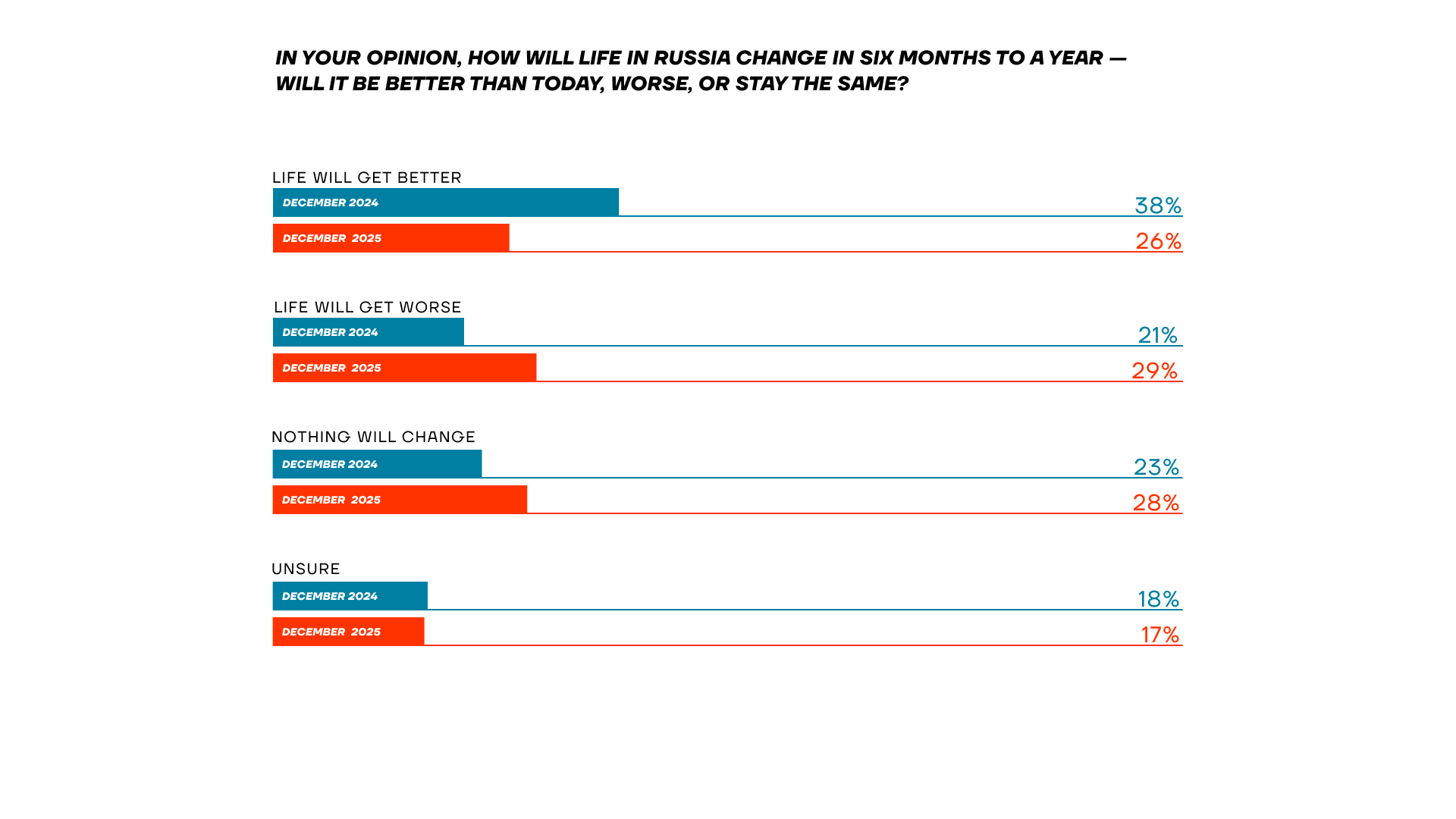 In 2024, 38% believed life would eventually improve. One year later, only 26% remained optimistic. Meanwhile, pessimism has grown: 29% now believe things will get worse.