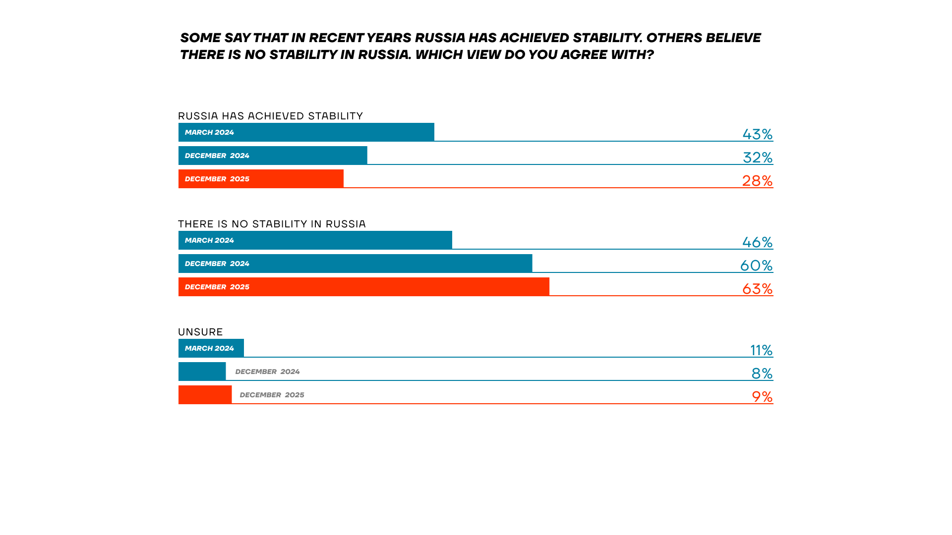 A year ago, 60% said there was no stability in the country. Today, that figure has risen to 63%. Meanwhile, the share of those who believe stability exists has continued to shrink — now down to just 28%.