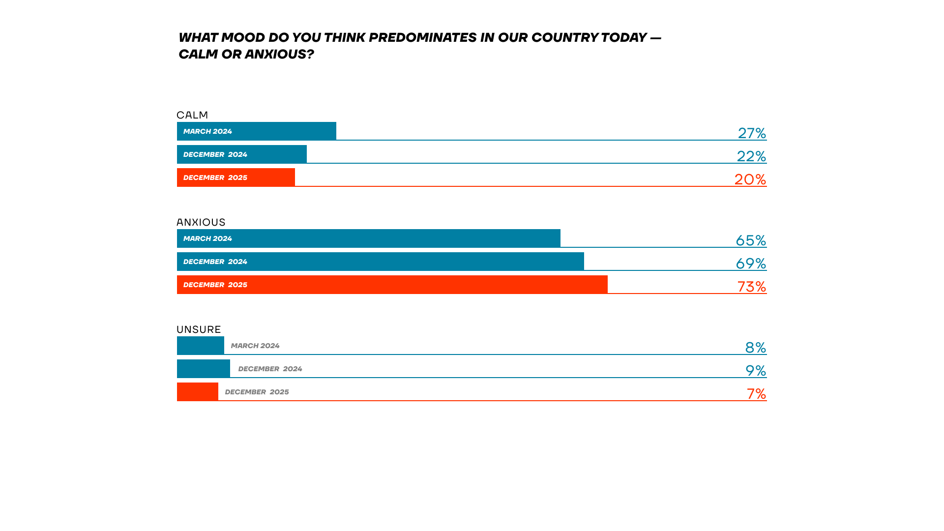 When it comes to anxiety, the situation is even worse. We ask respondents how they feel overall — calm or anxious.