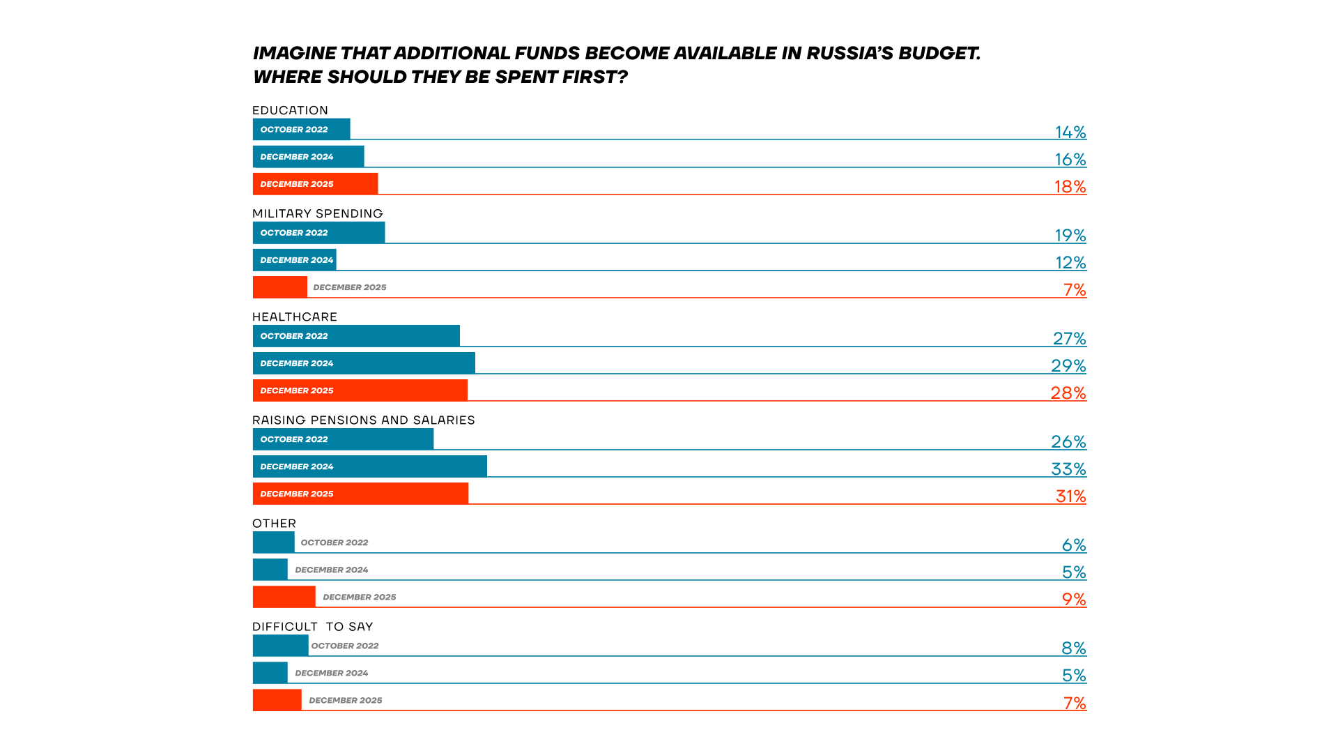 But it is becoming increasingly difficult for Putin to deceive Russians. The share of people who believe the war will end soon is steadily declining — despite the regime’s attempts to project “readiness for peace.” Nearly half of respondents believe the fighting will continue, even though, as we’ve seen, the war itself is deeply unpopular. People want peace as soon as possible and do not want to spend money on war.