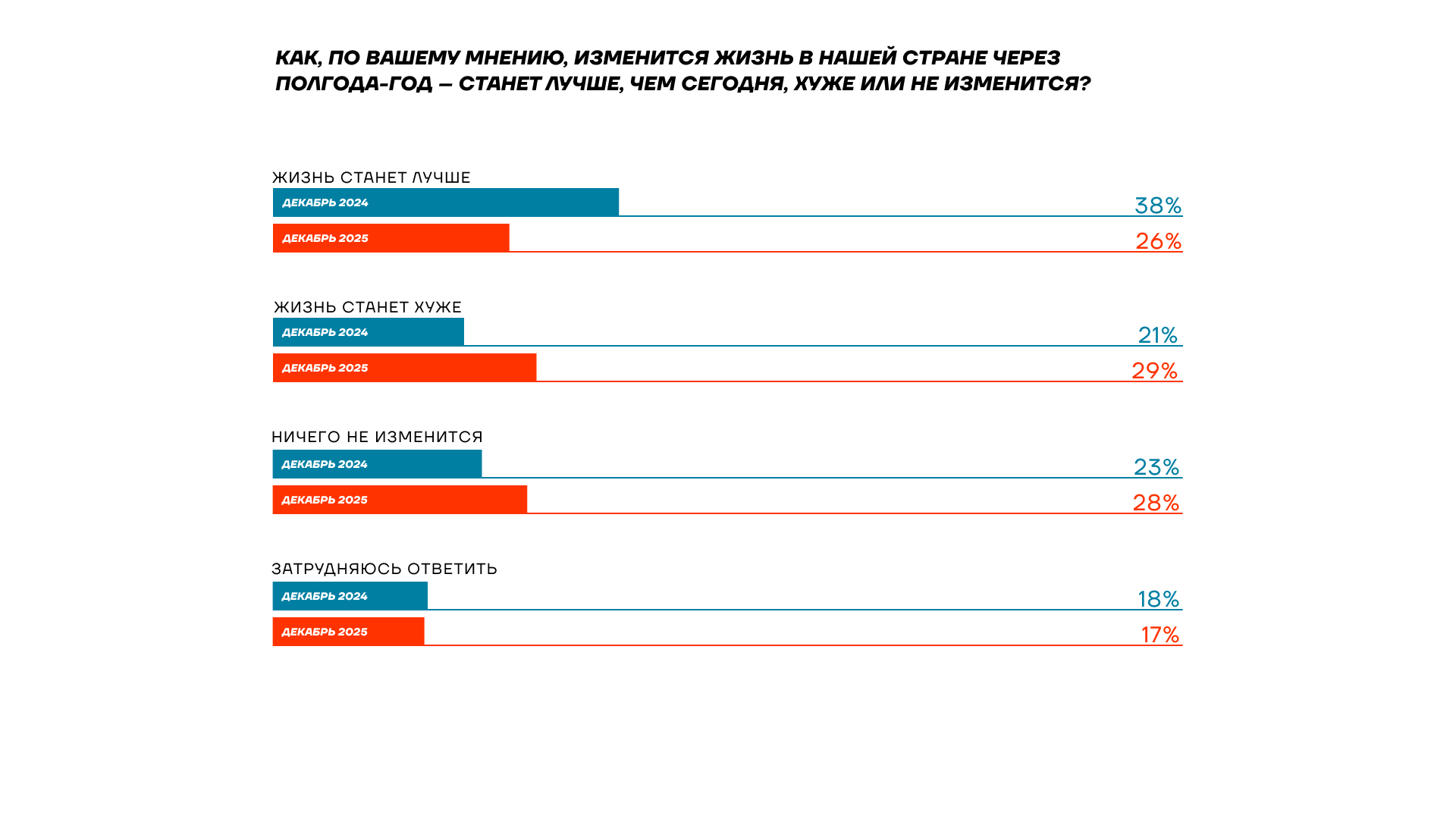 Только посмотрите на то, как изменились ответы за один год: 38% в 2024 году надеются, что жизнь все-таки станет лучше. Прошел год — и таких оптимистов осталось только 26%. А пессимистов стало больше — 29% считают, что будет хуже.
