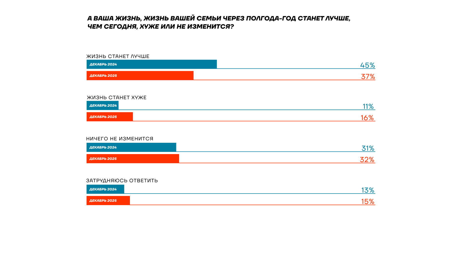 Тут мы тоже наблюдаем падение: 45% год назад верили в перемены к лучшему, а сейчас таких — 37%. И тех, кто считает, что их жизнь станет хуже стало больше — на 5% пунктов.