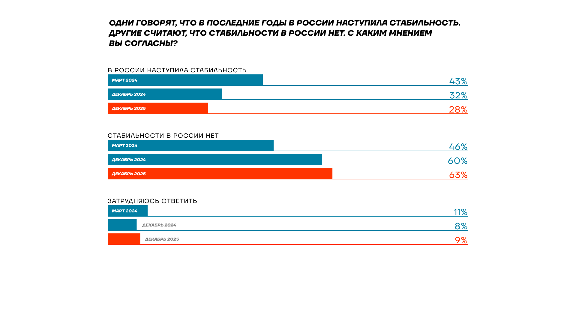 Год назад 60% считают, что стабильности в стране нет, сейчас таких — 63%. А процент тех, кто наоборот считает, что стабильность есть, уменьшается — сейчас таких осталось только 28%.