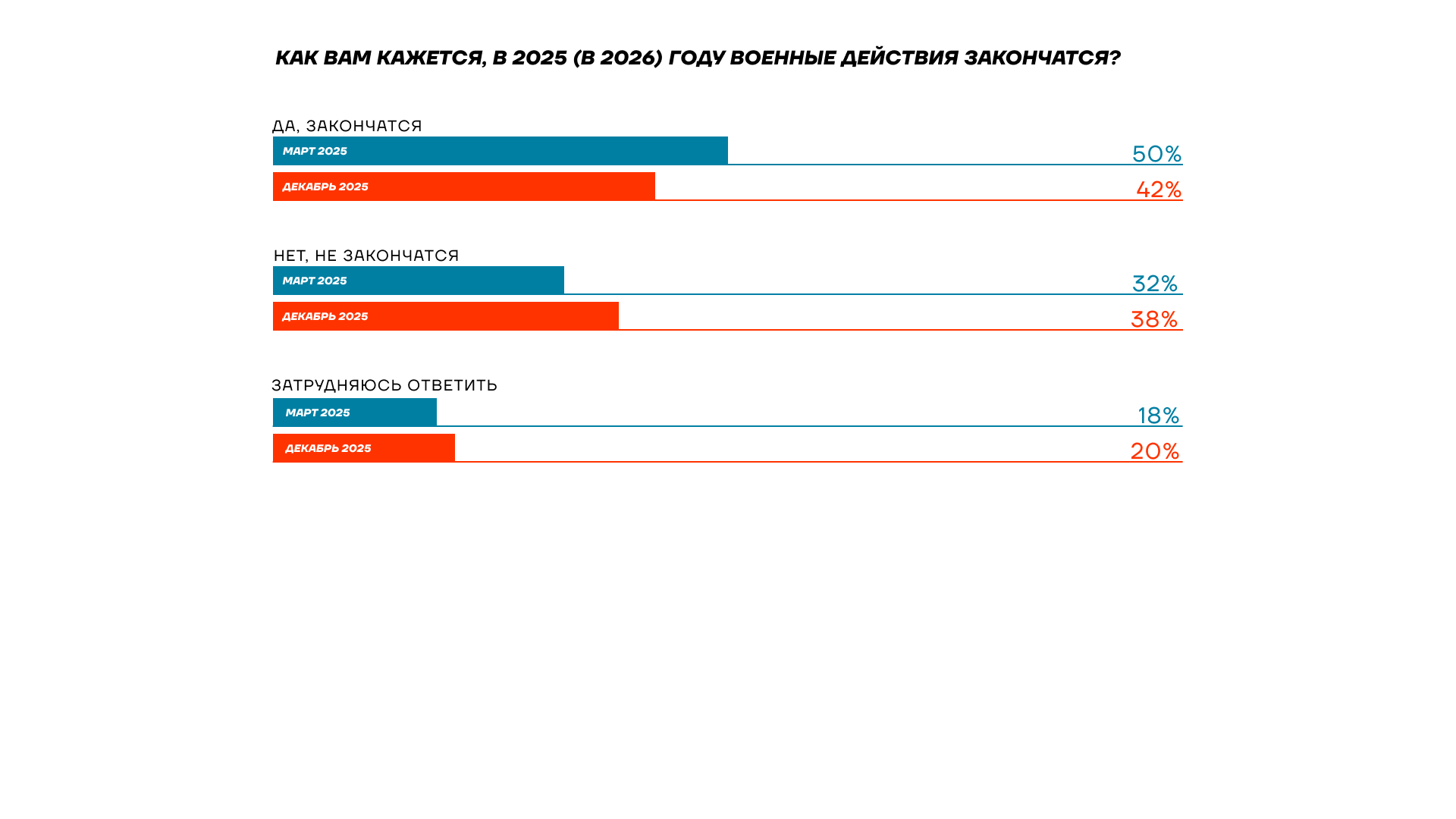 Но обманывать россиян Путину становится всё сложнее. Доля тех, кто верит в скорое завершение войны, заметно снижается — несмотря на попытки режима изображать «готовность к миру». Почти половина опрошенных считает, что боевые действия будут продолжаться — при том, что, как мы только что видели, сами боевые действия крайне непопулярны, люди хотят скорейшего мира и не хотят тратить на войну деньги.
